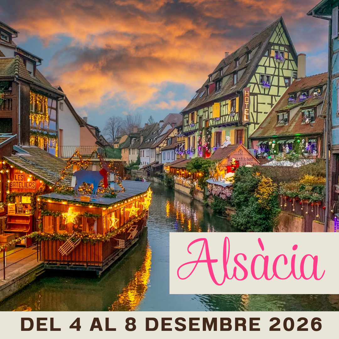 - Tot seguit, entre vinyes i muntanyes, a 9km de distància, arribarem a COLMAR la ciutat on França i Alemanya es donen la mà, on cada pedra té una història i on cada pas desperta una emoció. A l’aire s’hi olora la flaira de pà acabat de fer, de formatge Munster i del vi calent especiat. Els canals recorren el casc antic com si fóssin venes d’aigua que donen vida als seus barris, en especial a La Petite Venise. Colmar no cel·lebra el Nadal, l’encarna. No es mira, es contempla. No es vista, se sent. Visitarem els seus mercats de nadal entre casetes de fusta, rames d’avet i guirnaldes que en oferiran tresors artesanals i es convertiran en un refugi de nostàlgia, on el temps passa i el cor, per un instant, ens farà caure novament a la infantesa.